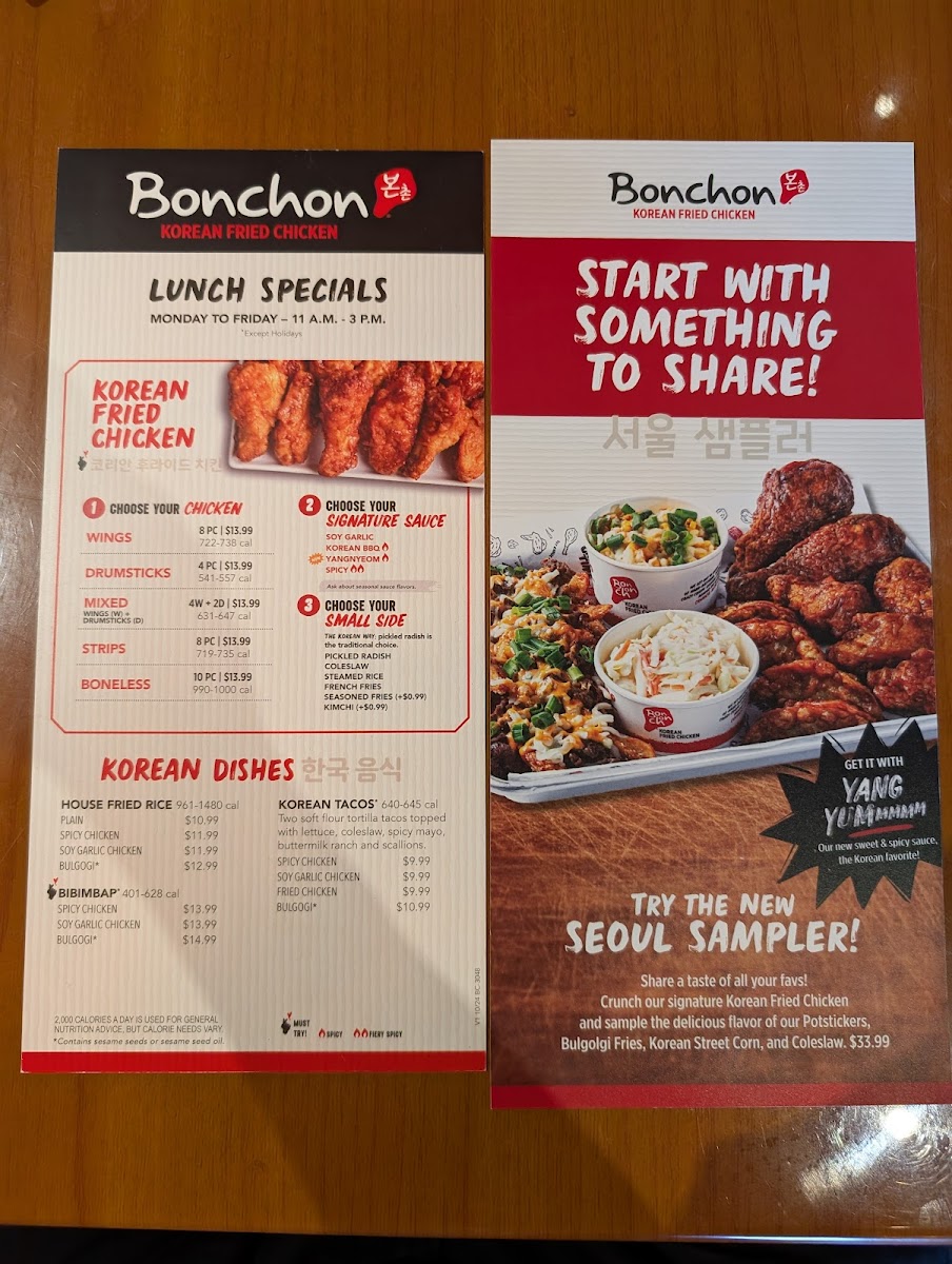 Hand-brushed with your choice of a Bonchon Signature Sauce and a side.