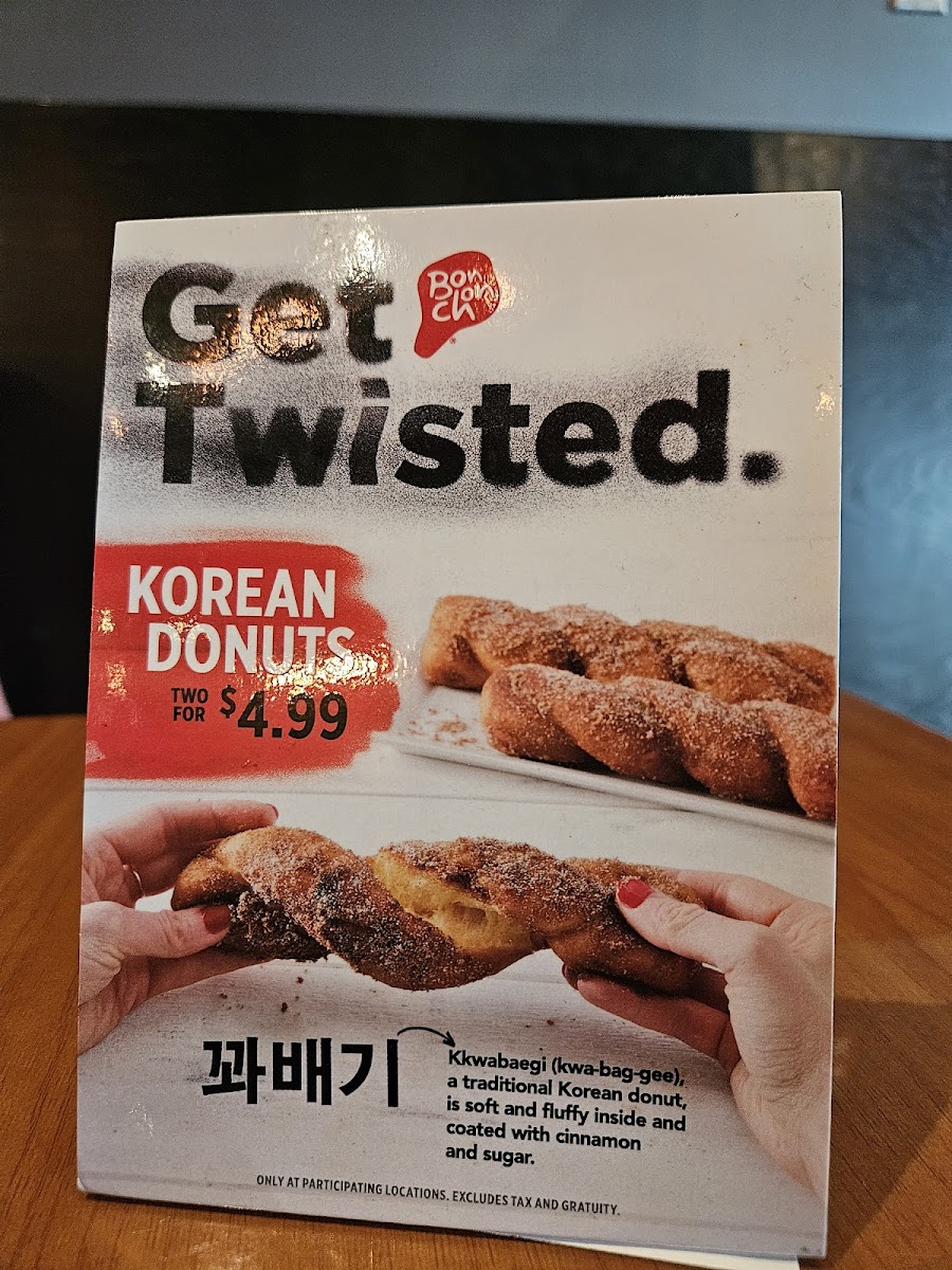 One traditional soft and fluffy Korean donut coated with cinnamon and sugar on the outside, served with a sweet cream dipping sauce.